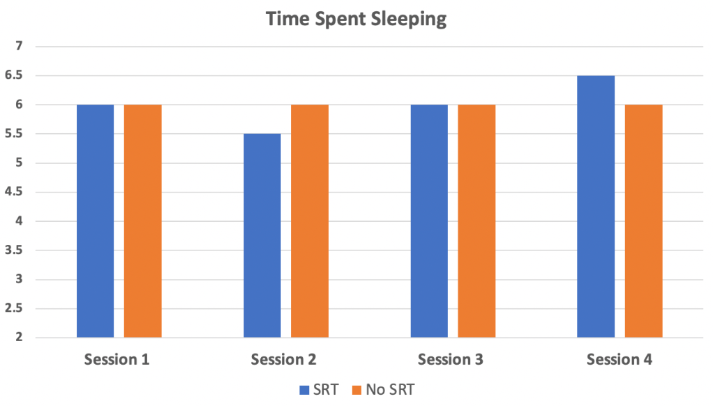 In this example, you can see a slight decline in sleep duration after the first session with sleep restriction therapy because the body is adjusting. Some sleep deprivation in the first weeks beginning the treatment is common. What happens after is that our sleep drive kicks in and returns back to baseline within a couple weeks. There may even be an increase (as you see in session 4) because the person begins to feel more confident about their sleep and anxiety reduces. Anxiety can sometimes mask sleep because your body is in a fight-or-flight response, which is of course an enemy of sleep.